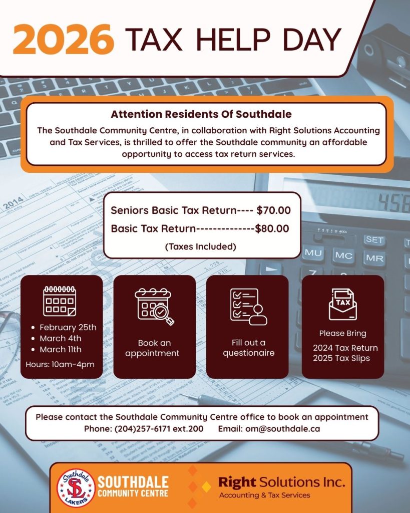 The Southdale Community Centre, in collaboration with Right Solutions Accounting and Tax Services, is thrilled to offer the Southdale community an affordable opportunity to access tax return services.